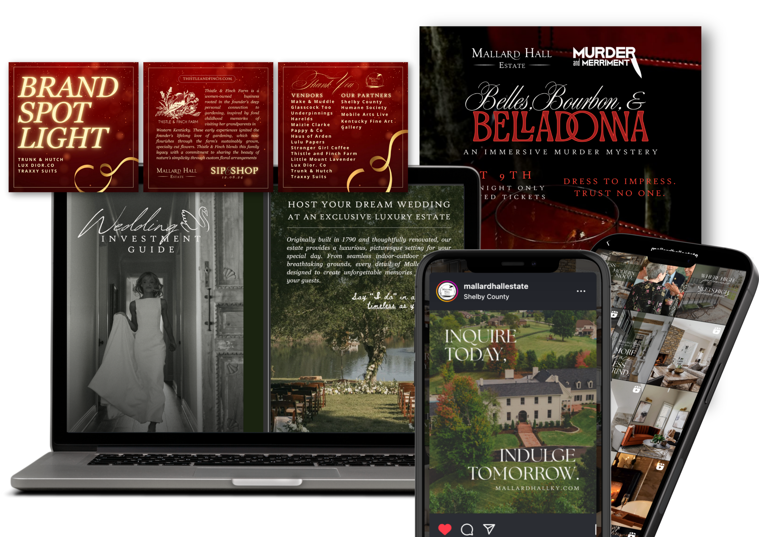 As the primary creative for Mallard Hall Estate, a luxury event venue in Kentucky, I oversee their entire visual and marketing ecosystem — from digital strategy to on-site event design. My work ensures every detail feels refined, cohesive, and true to the estate’s “old money” elegance.